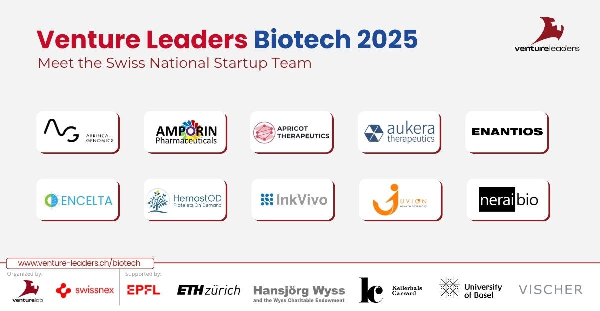 “Ten startups have been selected for the 2025 Venture Leaders Biotech program, which will take them to Boston from June 23rd to 27th as part of the Swiss National Startup Team. During their roadshow, the entrepreneurs will connect with international investors and industry leaders, acquiring expertise to help scale their ventures. Venture Leaders Biotech is organized by Venturelab in partnership with Swissnex Boston & New York and supported by the University of Basel, EPFL, ETH Zurich, Hansjörg Wyss, Kellerhals Carrard, and VISCHER.”
